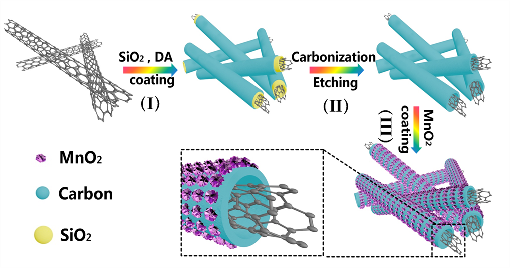 低维材料与清洁能源创新型科技团队以碳纳米管(CNT)为基本骨架,通过模板法,以多巴胺为碳源和氮源,在模板二氧化硅的表面包覆了一层多孔碳层,最终构建出了双层中空碳管,经过冷冻干燥和水热等过程,成功制备出双层中空碳管与超薄二氧化锰片的复合材料(CNT@NCT@MnO2)。