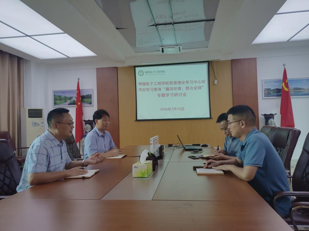 7月10日,学院党委理论学习中心组在理科楼911室围绕“廉洁纪律、群众纪律”进行专题集体学习研讨。学院党委理论学习中心组成员参加学习研讨。学习研讨由学院党委书记方明科主持。