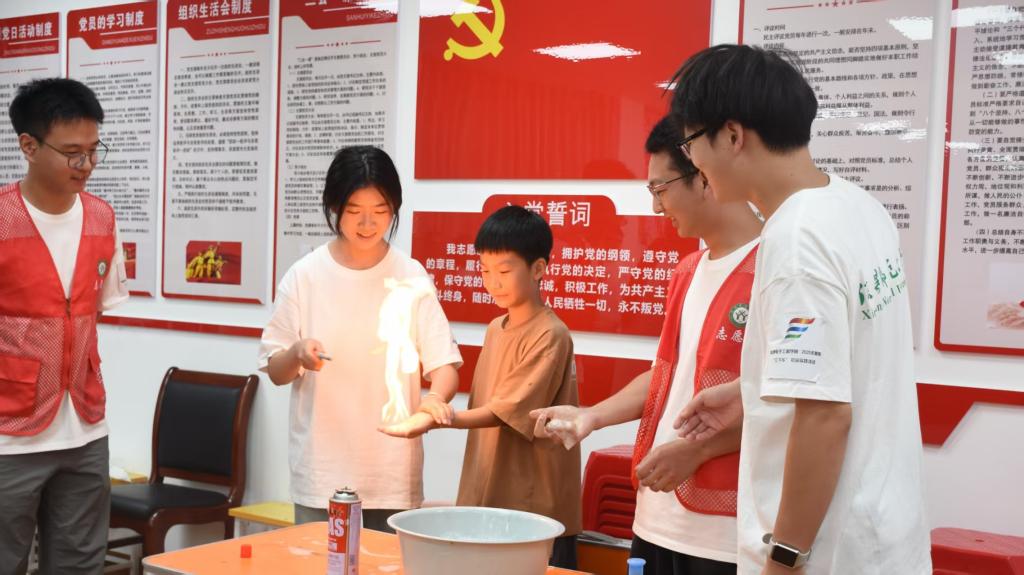 童趣探秘,科学世界初感知。志愿者创新课堂形式,以纸杯投影仪直观展示光的传播原理,借 “火焰掌” 实验生动演示化学能到热能的转化。通过一系列趣味实验,将抽象的物理、化学知识转化为可感可触的体验,引领孩子们探索科学的奥秘,点燃他们对科学的热情,启迪创新思维。