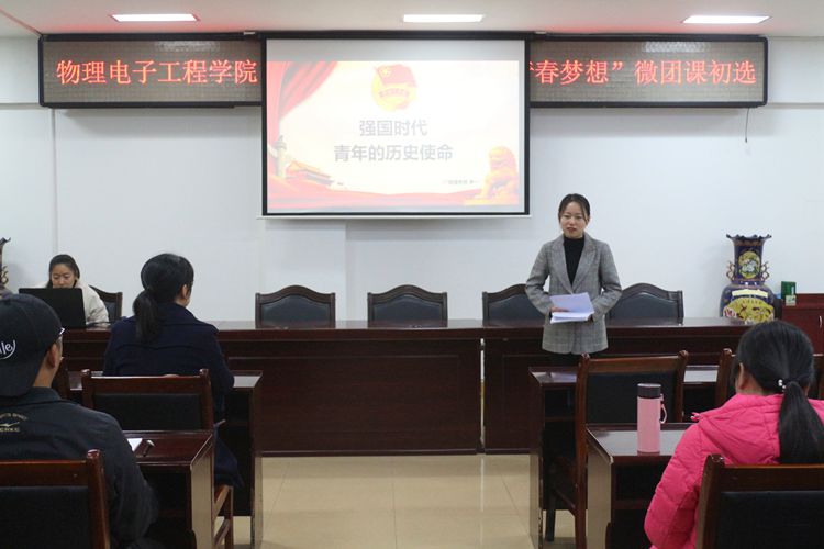 为深入学习贯彻习近平总书记系列重要讲话精神,切实提高广大新生团员的理论素养和实践水平,11月18日,电影网站 于理科楼515会议室顺利开展“乘新时代东风,放飞青春梦想”微团课初选活动。电影网站 团委老师黄钰莹莅临现场,与部分学生干部共同参加此次活动。