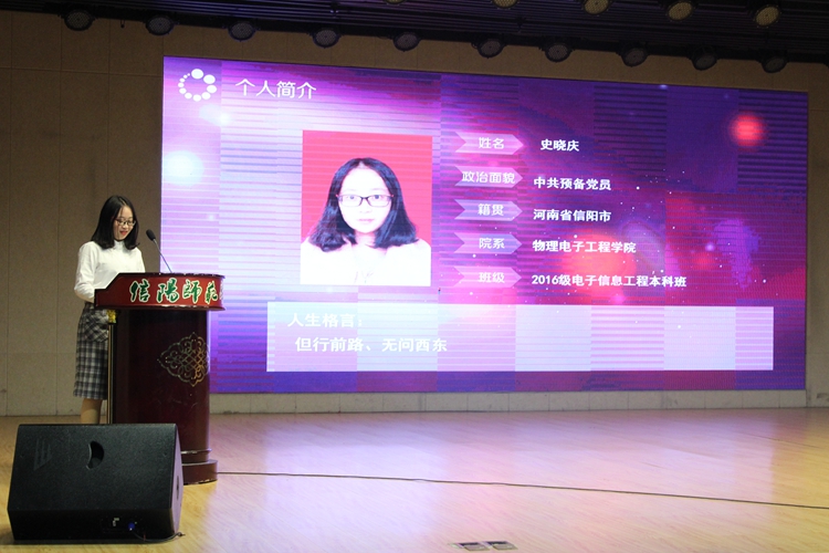 12月5日,由我校学工部、团委、学生会、研究生联合会举办的信阳师范学院第十三届“大学生自强之星”评选活动在理科楼报告厅举行,电影网站 2016级学子史晓庆荣获信阳师范学院第十三届“大学生自强之星”的称号。