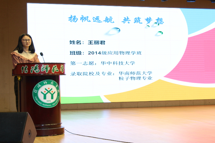 四名考研成功的学生代表依次同在场师生分享自己的考研经验。物理学专业的周方杰从选择、学习、心态三个方面介绍自己的考研心得。选择方面,她提醒备考学子们全面充分认识自己,要根据自己的优势和劣势挑选学校及专业。学习方面,她分时间、用书、分类、考前四个部分向大家详细介绍自己的学习方法,分享自己的学习技巧,其优秀的逻辑思维能力、严格的自我约束能力获得在场师生一致称赞。应用物理班的王丽君着重介绍了其考研调剂的艰辛历程,鼓励学子们主动出击,自寻机会,为现场学子们今后解决相关问题提供了宝贵经验。电子信息技术班的邢中秋结合自己考取郑州大学信息与通信工程专业的经历,从院校选择、学硕专硕、各科复习、心得感悟四个方面分享自己的考研经验。期间,她向大家详细介绍了自己复试的流程与形式,提醒考研学子主动联系导师,积极准备笔试,以饱满的精神迎接每一个问题。2015级备考学生代表闫卉梅发言。她号召学子们积极树立考研标杆,正确对待考研路上的困惑与艰难,以坚定的信念、顽强的精神书写青春路上的华丽篇章。