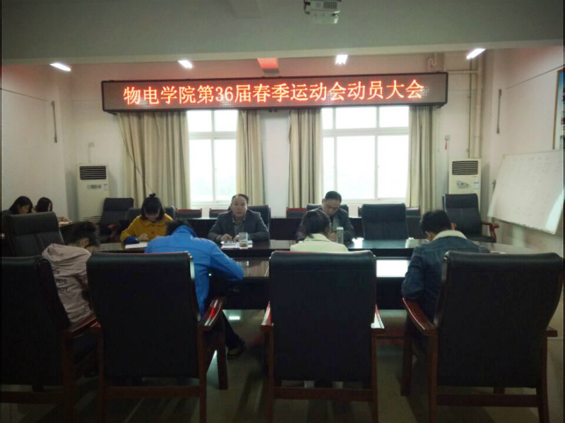 4月11晚,物电学院于理科楼911会议室开展第36届春季运动会动员大会,电影网站 党委书记柳士刚,副书记李刚,院团委老师黄钰莹,学生会主席团成员及相关部门部长参加此次会议。会议由李刚主持。