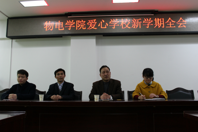 3月1日,物电学院爱心学校在理科楼举行新学期第一次全会。出席会议的有物电学院党委副书记李刚,团委老师黄钰莹,爱心学校社会指导老师王相亚,学生会主席龚佳全,副主席王娜杰以及爱心学校各部门代表。