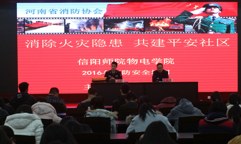 特邀河南省消防协会专职教员贾雪建担任主讲人,党委副书记李刚,辅导员张彦飞,张康华,杨勇,黄钰莹及16级全体学生参加了本次大会,会议由李刚主持。
