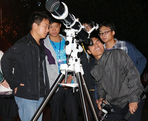 活动现场,不同造型的观测仪器抓住了老师和同学们的眼球,他们被心中的好奇心所驱使,带着求知的本能迫不及待的加入了观测者的行列。指导老师以及协会部分成员一边给大家示范怎样利用天文望远镜寻找目标,一边耐心细致的讲解月球的月陆、月坑、月谷、月海等构造的由来。观测者们在指导下,借助天文望远镜看到了一个更加真实的月球,而不再神秘的月球激发出了观测者们愈加浓厚的兴趣,也由此引发出了更多的疑问,这些疑问促使他们去探索问题的答案,从而获得更加丰富的知识,而由此也达到了举办本次观测活动的目的。