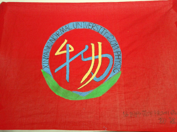 在本次大赛中,班旗要求规格统一,图形简单明了,且有象征意义和内涵,能突出本班的特点,大赛主要针对学院2011级各班。各班积极参与,设计出具有自己班级独特风格的班旗。经过班旗的制作、班旗的评比等阶段的准备,4月13日,学院在逸夫楼前展览各班班旗。物理学班将一个带有用英文写成的信阳师范学院的圆环包围着一个“物”的图案作为班旗,其象征着物理学班同学的团结友爱,“物”是由数字“1”和“5”及代表11级的两撇组成,和外面的圆环一起代表了11级物理学班的105名成员的团结友爱的集体精神;电子科学与技术班以一个拳头和英文字母组成的火的图案作为班旗,图案中的拳头代表班级的力量,英文字母代表班级的名称,“火”则代表着全班同学的似火的热情;应用物理班以一只奖杯,和火苗组成的字母“W”的图案作为班旗,奖杯的形状代表的英文字母“Y”和字母“W”一起代表应用物理学班,火苗代表着班级成员的热情;电信班以一只张着大口的狮子和两道闪电及电信两字共同组成的图案作为班旗,狮子张着大嘴吐出电信两字,象征着电信班的威武形象,两道闪电则代表了11级。各班班旗均简单明了,寓意深刻,体现了各班级的精神与特色,同时体现出大家对班级的热爱和大家的团结精神。