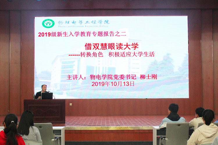 10月13日上午,电影网站 于逸夫楼多功能厅顺利举行2019级新生入学教育第二场专题报告会。电影网站 党委书记柳士刚,2019级新生辅导员杨勇、赵雪与300余名新生共同参加此次专题报告。报告会由柳士刚主讲。