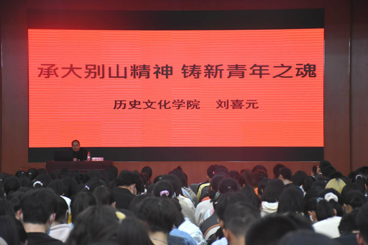 刘喜元发表讲话。他指出大别山精神在党的发展历程中占有重要地位,值得当代青年弘扬与传承。他结合有关党、革命根据地、英雄烈士等故事,从“坚韧忠诚”“胸怀全局”“朴诚为民”“不胜不休”四个方面,通过 PPT、数据、事例深刻形象阐述大别山精神的实质与核心意义,期望全体新生铭记历史,担当使命,继承和发扬大别山精神。刘喜元以“大学生为什么而读书”为切入点,引出大别山精神即新青年之魂。他以建设中国特色社会主义和实现中华民族伟大复兴的中国梦为时代背景,结合习总书记对青年的期待寄语,希望全体新生树立远大理想,担当时代责任,锤炼品德精神,勇于砥砺奋斗,鼓励在座新生树立正确人生观、价值观,胸怀远大志向,勇于奉献,为中华民族伟大复兴添砖加瓦。刘喜元富有感染力的讲话引发学子深刻思考,学子们纷纷表示受益匪浅。