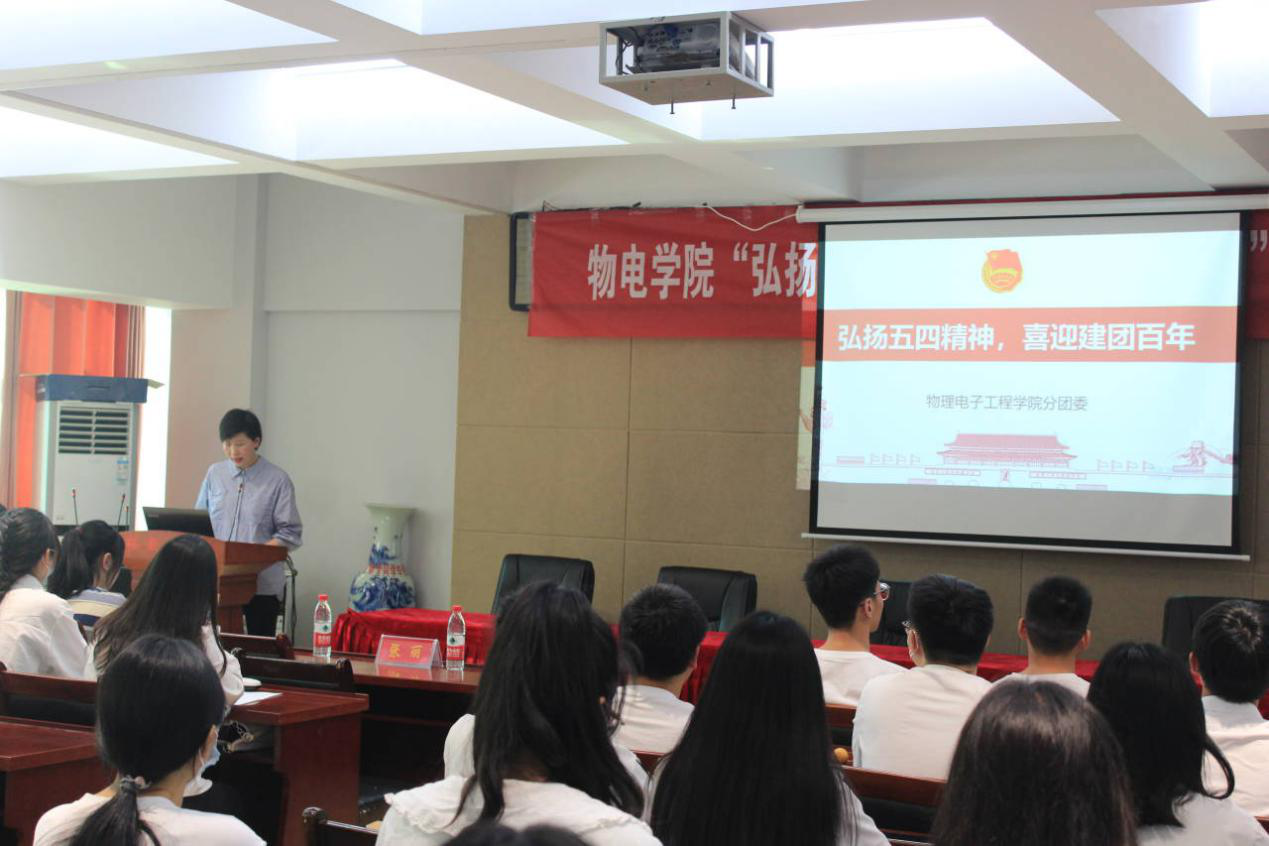 主题团日活动在庄严的团歌声中拉开序幕。物理学一班团支书刘梓涵以“弘扬五四精神,喜迎建团百年”为题,从五四运动的回顾、时代楷模的力量、当代青年的责任三个方面讲授团课。她表示新时代青年要勇担时代重任,牢记党的嘱托和团的宗旨,继承团的光荣传统,不断加强政治意识、组织意识和模范意识。紧接着,团员代表周颖带领青年团员重温入团誓词,铿锵有力的宣读再次锤炼团员的团性,有力地表达青年团员对团组织的坚定决心。