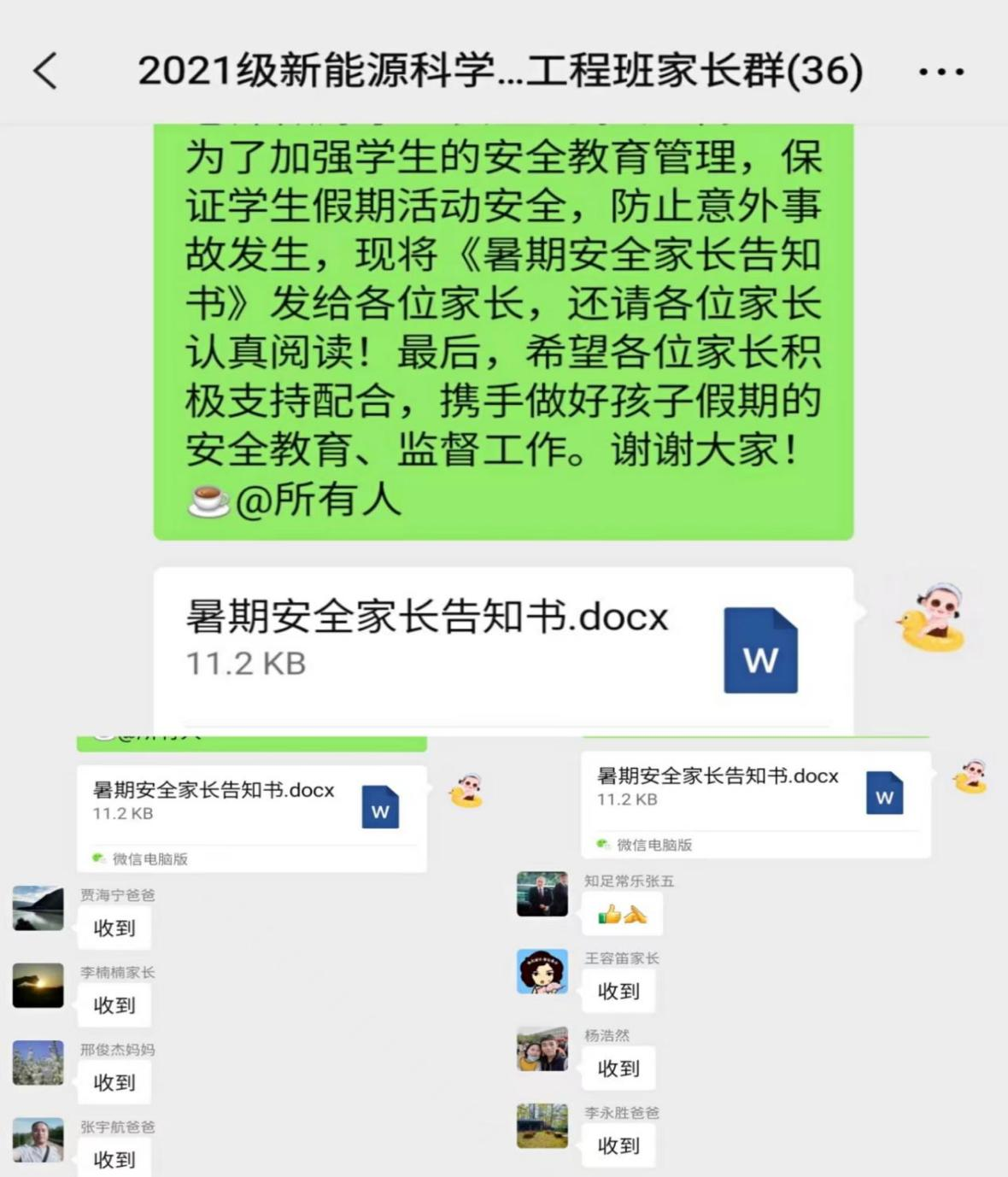 学院全体专兼职班主任严格落实学校文件精神和学院会议精神,提前筹划,精心准备,以班级为单位,通过学生喜闻乐见的形式,认真开展安全教育主题班会,引导学生将安全意识入脑入心,时刻提醒学生重视暑期安全防护。同学们纷纷表示:暑假期间定会谨遵老师教导,切实注意自身安全防护。放假前,各位班主任将《暑假安全家长告知书》传达、告知到每位家长,明确监护职责,加强对孩子的监督管理,时刻关注孩子动向,并且要熟悉当地疫情防控形势和疫情防控政策的变化,做到非必要不外出,家校合作,全方位地为学生打造安全屏障。