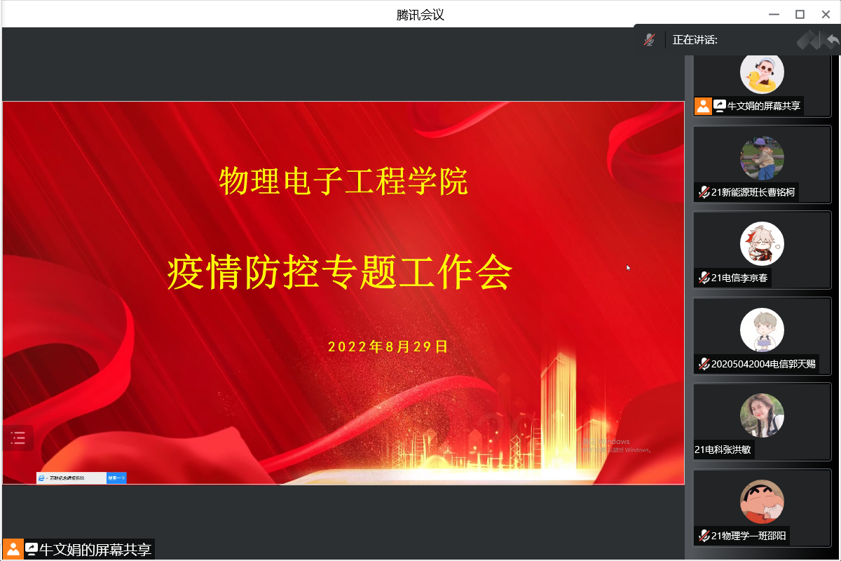召开疫情防控专题会。根据《信阳师范学院2022年秋季学期开学工作方案》,结合电影网站 实际情况,电影网站 于8月29日召开疫情防控线上专题工作会,学生会干部、各班班长参会。会上,团委老师牛文娟向同学们传达并解读了《信阳师范学院2022年秋季学期本专科学生返校报到须知》,党委副书记张丽就如何做好学生开学返校的疫情防控工作进行安排部署,确保学生能够顺利、平安返校。