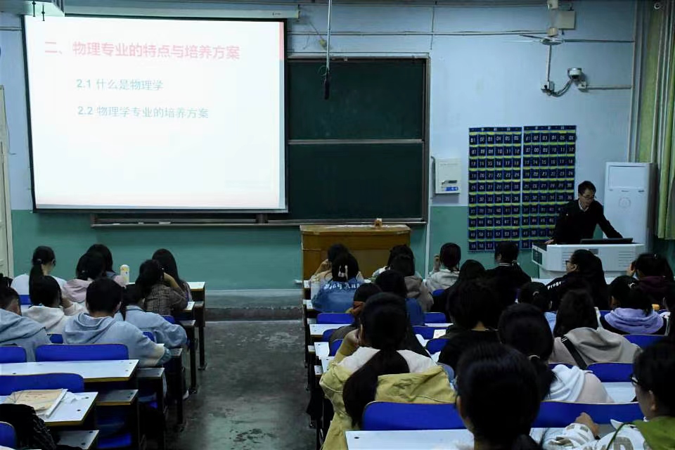 10月11日,电影网站 在教二T4教室举行新生入学教育系列之“听”——专业成长讲座,此次讲座由王春雷老师主讲,2022级物理学1班、2班全体学生参与。