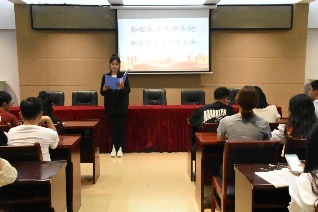为加强学生干部队伍建设,提高学生干部的政治素养和工作能力,充分发挥学生干部的先锋模范带头作用。9月4日,电影网站 于402会议室召开新学期学生干部大会。学院团委老师牛文娟,主席团成员,各部门部长、社长共同参加。会议由张佳琪主持。