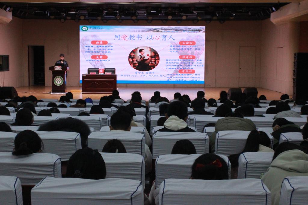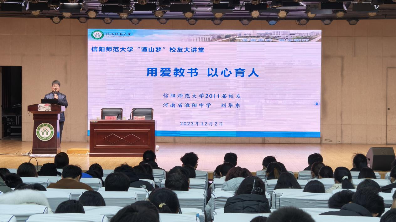 刘华东以《用爱教书,以心育人》为题,从个人学习经历出发,分享着自己教书育人的幸福,并把这份幸福传递。刘华东回忆起在信阳市八一小学支教的经历,鼓励同学们要保持对教育事业的热爱,坚定从教信念。