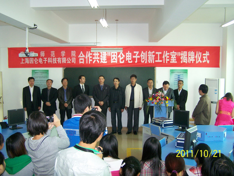 10月21日上午,信阳师范学院因仑电子创新工作室成立大会暨揭牌仪式在该院理科楼504实验室隆重举行。信阳师院副院长李义凡、上海因仑电子科技有限公司执行总监韩学能、工程师ALEJO、科研处处长武津刚、资产处处长陈向东、招生就业处处长刘守义、学生处副处长柳士刚以及物电学院党政领导出席了此次大会。仪式由物电学院主管教学工作的涂友超博士主持。