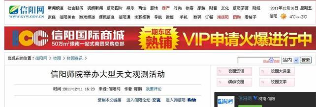 12月10日晚,物电学院“星空物语”天文观测协会分别在信阳市体彩广场和信阳师院八餐小广场同时成功举办了一场大型月全食天文观测活动,随后,中新网、河南教育网、河南文化产业网、信阳电视网、信阳网、今日网、大学生校内网等多家新闻媒体网站都对该项活动进行了积极地宣传报道(如下图,局部),并给予了充分地肯定,这将进一步激励我们今后更好地向公众开展各项科普工作。