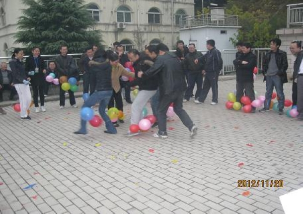 乒乓球比赛更是难上加难,教师需单手执拍将球传给对面的队友,而且球不能掉,否则,需从所在起点重新开始。比赛再度陷入紧张阶段。而踩气球比赛则以其轻松的模式缓解现场氛围的同时,也使运动会达到了高潮。教师们两两分组,分成三组,每人左右脚各绑三个气球,在哨声响起后,各队互踩对方的气球。教师们在踩别人气球的同时,往往顾及不到自己的气球而被别人踩破,后悔的更卖力的踩对方的球,此时的他们像是回到了童年,疯狂、快乐。最后一场是雷前友书记和学生进行比赛,他们一边保护自己的球,一边踩对方的球,砰砰声和师生的笑声融合在一起,构成了此时最美妙的声音。