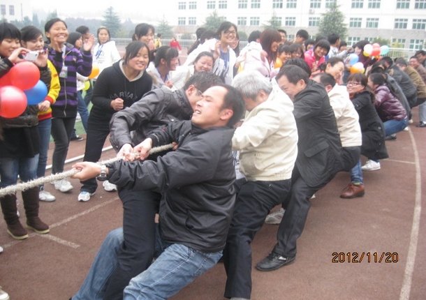 此次趣味运动会分为师生拔河比赛、摇呼啦圈、袋鼠跳跳乐、乒乓球接力赛和踩气球5个比赛项目。“加油!加油!…….”随着一阵加油声响起,师生拔河比赛正式开赛。第一组是教师队对阵教师队,在口哨吹响的瞬间,雷前友书记和余本海院长带领各自的队伍齐心协力,使出浑身解数,将绳子拉向自己所在队伍。双方斗气十足,赛势甚为紧张。经过三个回合的激烈角逐,余本海院长所在的一队获得胜利。第二组是教师队对阵学生队,只用了两个回合学生队就败下阵来。输掉比赛的教师队和学生队不甘心,希望在下个活动项目里展示自己的运动强项,而赢得这次比赛的教师队更是激情高涨,舒活筋骨准备下一项比赛——摇呼啦圈。