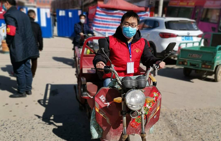 自2月17日以来,在驻马店市正阳县陡沟镇的街道上,电影网站 2016级学生干部张玉琪骑着三轮车为村民们配送生活必需品。疫情期间,村委为防止居民大规模进入超市造成人员拥挤现象,故超市和村委联合进行红色代办政策,居民每天在微信群里下单自己需要的物品,由红色代办员进行统计并在第二天进行配送。张玉琪得知这一消息,主动报名参加了红色代办员,他每天在微信群统计负责辖区的居民每日所需要的生活必需物品,并在第二天上午挨家挨户进行配送,每天从超市领取货物,再送到居民手里,还要走访看有没有不会用微信的老人。张玉琪在配送时必须要单独记录,保证每个人生活必需品不会短缺,他表示,配送的时候很辛苦,有时候午饭来不及吃,不过一起工作的都是大学生,大家一起工作抗击疫情感觉每天都很充实。