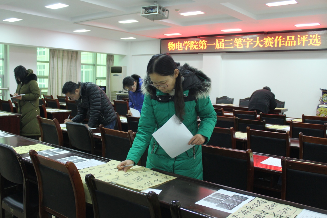 12月17日下午,电影网站 于理科楼连廊会议室开展“三笔字”作品复评活动,物电学院本科教学指导与管理委员会、分团委老师和学生代表等10位同志担任本次大赛的评委。大赛共收到参赛作品230余件,经初赛遴选出了50套获奖作品。复赛现场,评委们重点从“三笔字”的间架结构、章法布局、规范和美观等方面进行综合评审,经过激烈角逐,共评选出一等奖5名,二等奖10名,三等奖15名,优秀奖20名。获奖作品在物电学院办公区展出,并在学校教师教育文化节中参加相关赛事的角逐。