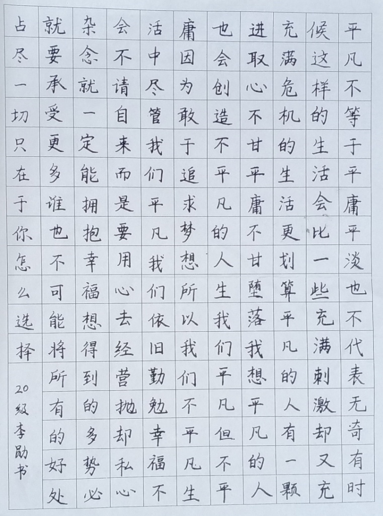 本次活动自11月初启动以来,以“笔尖风华肆意绽放”为主题,主要分为粉笔、钢笔、毛笔三项比赛,包含投稿、初评、复评、颁奖等四个环节,以2018级物理学专业学生为主要参赛对象,其他年级和专业学生自愿参加。学院以宿舍为单位为师范生免费配备了小黑板、字帖、练字纸、墨汁、毛笔、粉笔等材料,以赛带练,推动全院学生自主进行“三笔字”书写训练,引导学生把写好汉字、每天练字作为一种日常化的行为。