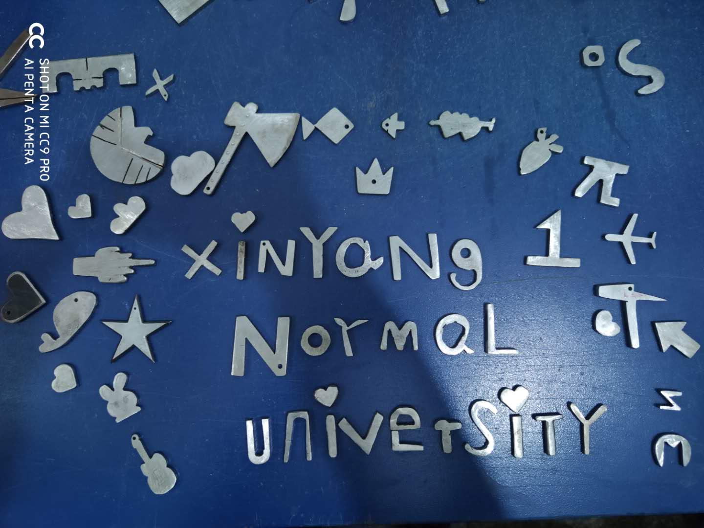 金工实习分为车工实训和钳工实训两项,车工实训内容为多人一组使用车床共同加工一根简易阶梯轴,钳工实训要求学生熟练使用台式虎钳、锉刀、钢锯、台钻等工具独立完成一件作品。在师生的共同努力下,学生们圆满完成了实训任务,特别是在钳工实训环节,学子们设计制作了“Xinyang Normal University”的我校英文全称图案和其他一些妙趣横生的作品。