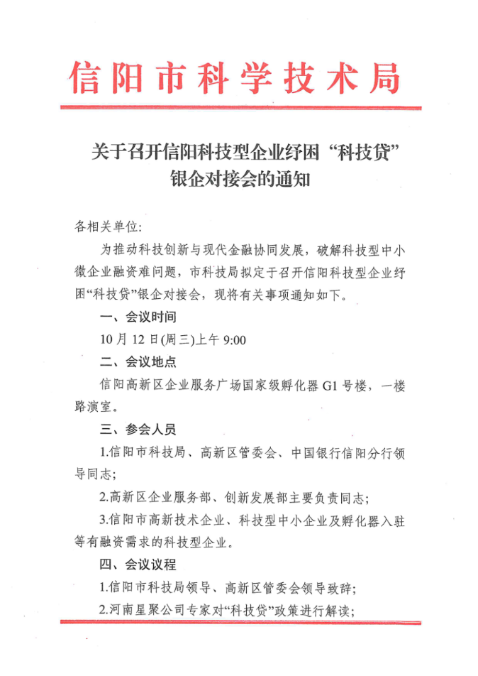 关于召开信阳科技型企业纾困“科技贷”银企对接会的通知