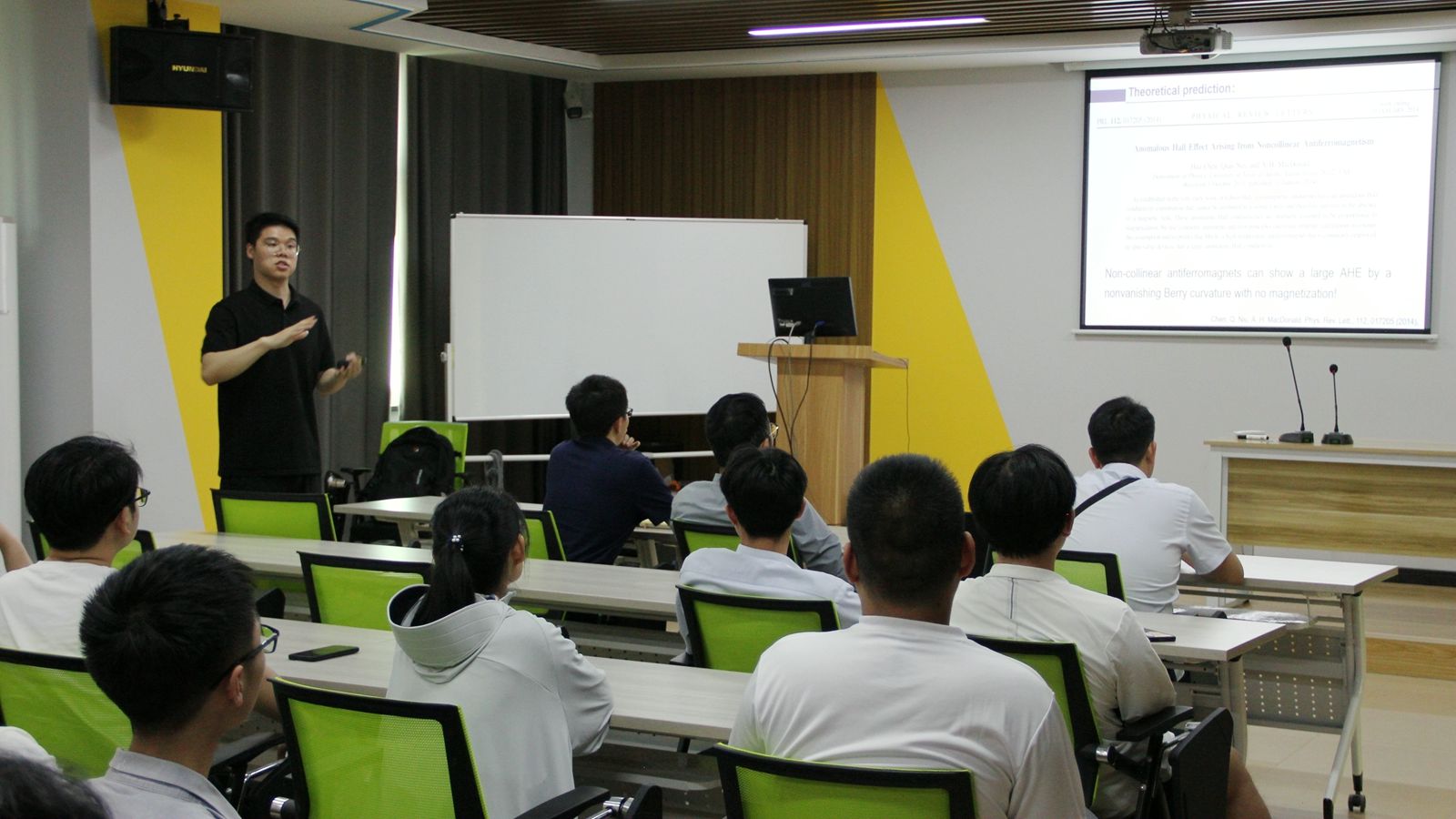 李小康首先从霍尔效应、反常霍尔效应等基本概念出发,介绍了电子的霍尔效应和声子的热霍尔效应,对绝缘体系中声子热霍尔效应(SrTiO3,铜氧化物高温超导体,α-RuCl3)的最新进展及争论进行了概述。接着,李小康介绍了其在非磁绝缘体SrTiO3、非磁单质材料黑鳞等体系中发现声子热霍尔效应的系列工作。报告中,李小康以浅显易懂的语言,不但介绍了该领域的前沿研究成果,更是复现了自己在科学研究中归纳、思考、提炼科学问题和设计验证实验的整个过程,为师生们今后科研工作提供了有效的方法论。最后,李小康详细回答了与会老师和学生提出的问题。