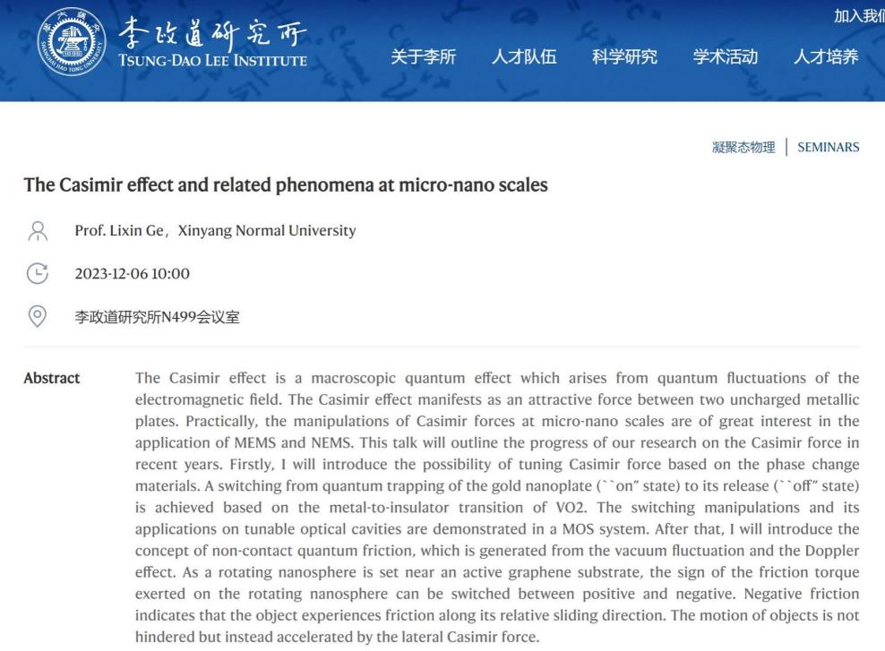 12月6日,电影网站 青年教师葛力新博士应李政道研究所的邀请,作了题为“The Casimir effect and related phenomena at micro-nano scales”的学术报告(Seminar), 通过线下和腾讯会议的方式同时进行。