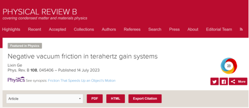 近日,电影网站 青年教师葛力新博士在《Physical Review B》上发表题为“Negative vacuum friction in terahertz gain systems”的研究论文,并被美国物理学会(APS)旗下的物理杂志特别报道(Featured in Physics)。