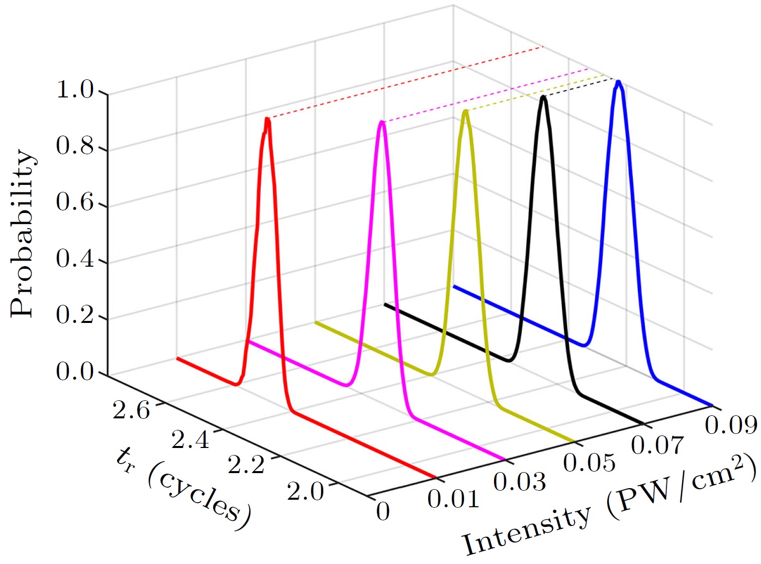 图1:五种不同激光强度下非次序双电离再碰撞时间分布。